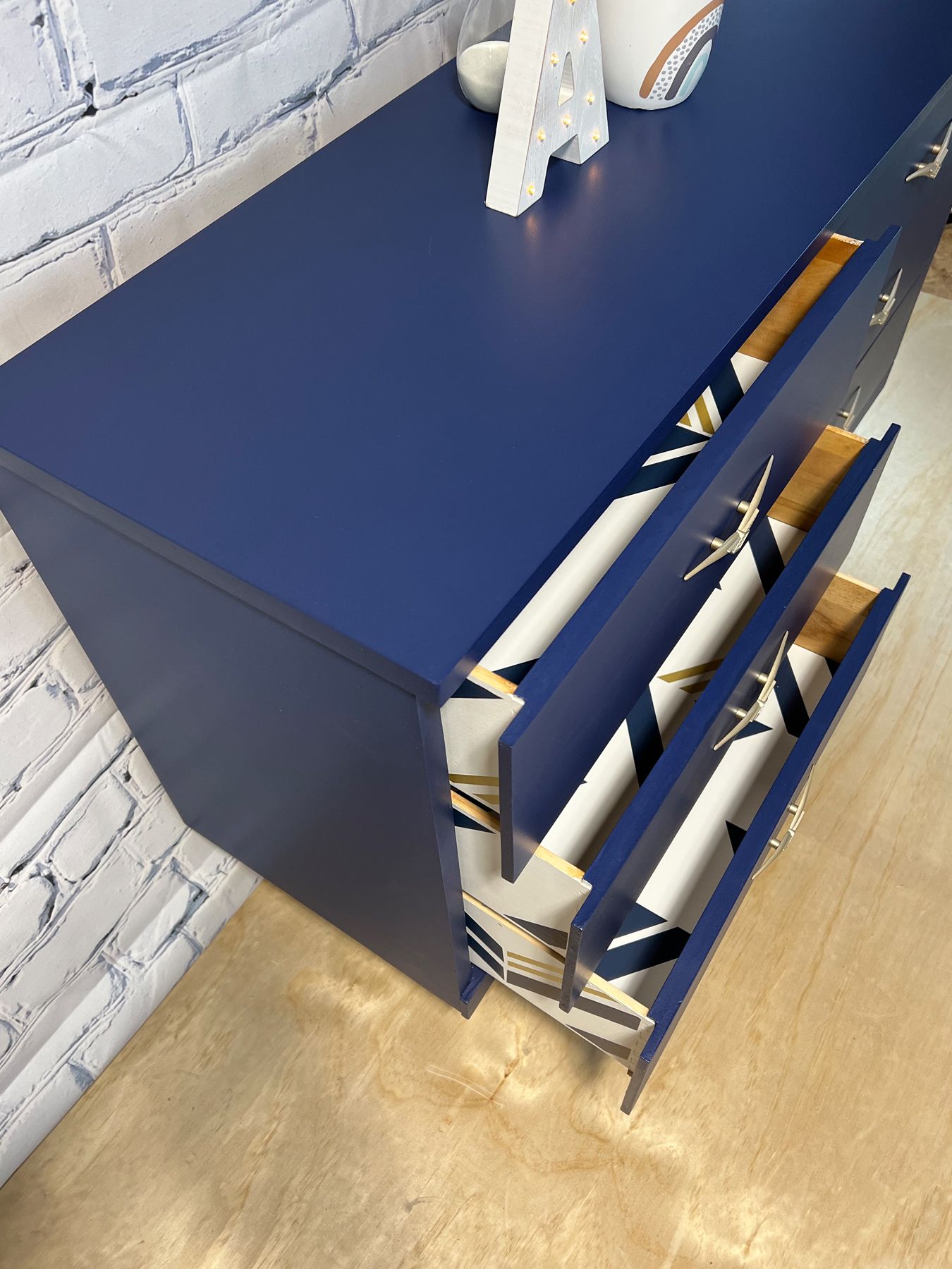 Refinished MCM dresser with MP in Liberty Blue and sealed with FMP Stain and Finishing Oil in Natural. Peal and stick paper line the drawers.