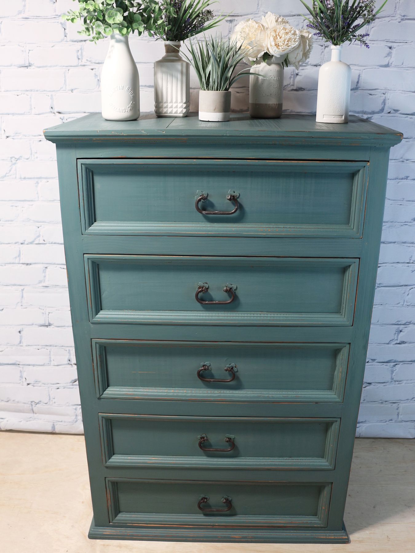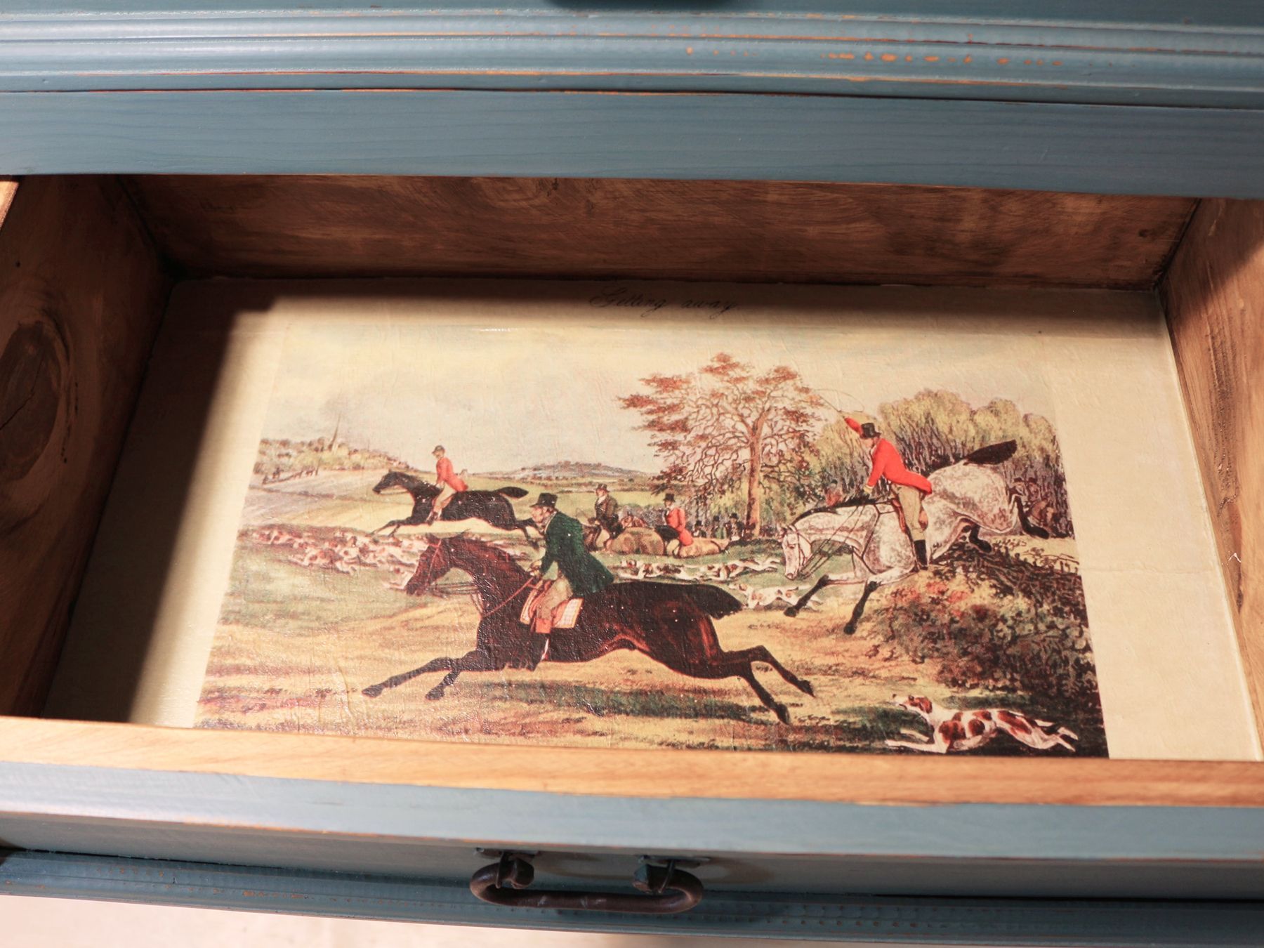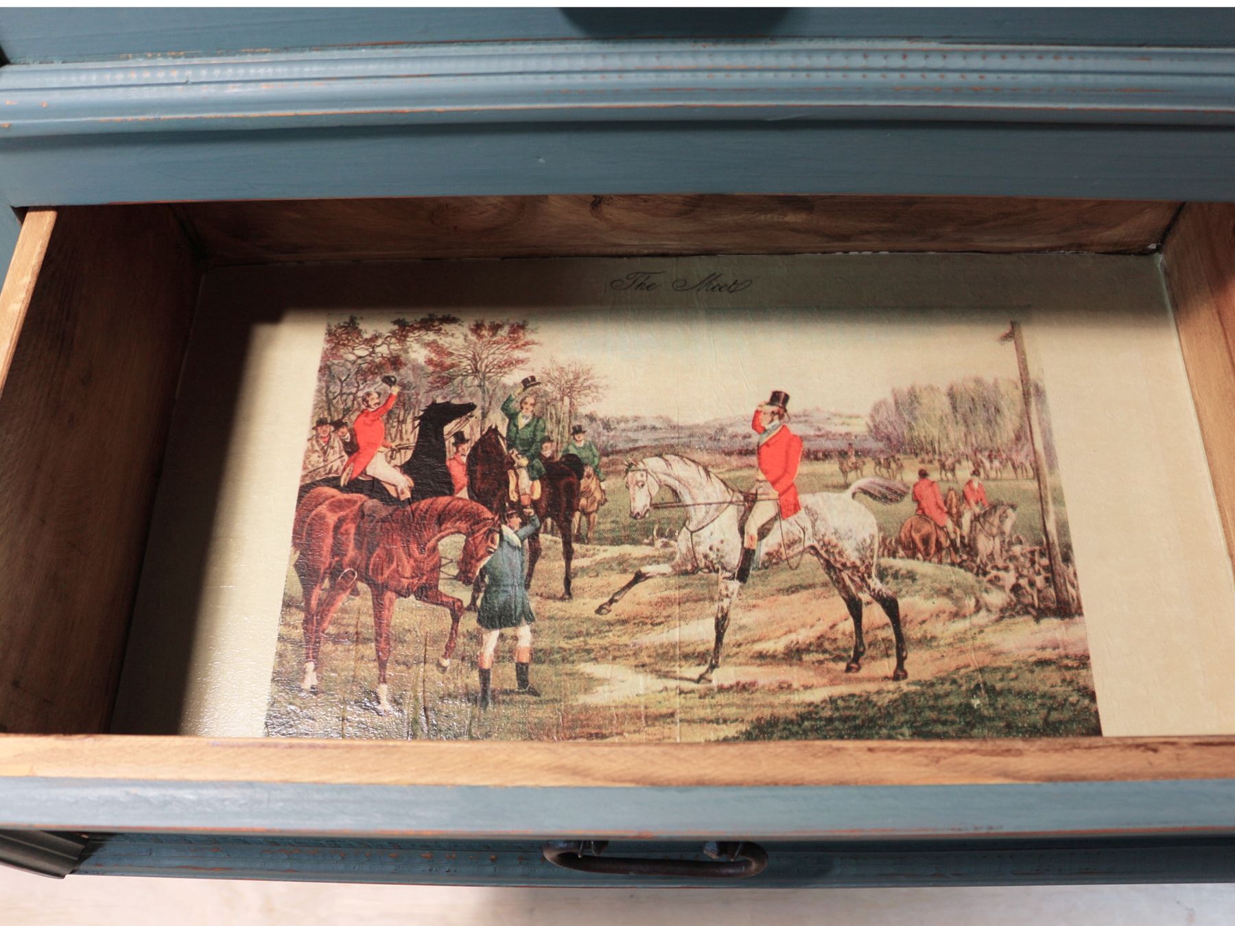 Refinished, distressed solid wood Dresser with Fusion Milk Paint in Terrarium and sealed with FMP Hemp Oil. Insides of drawers are decoupaged with a Fox Hunt print.