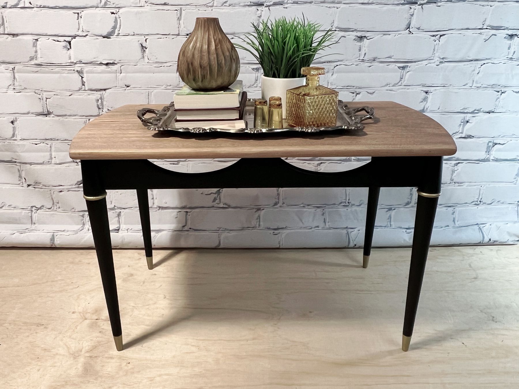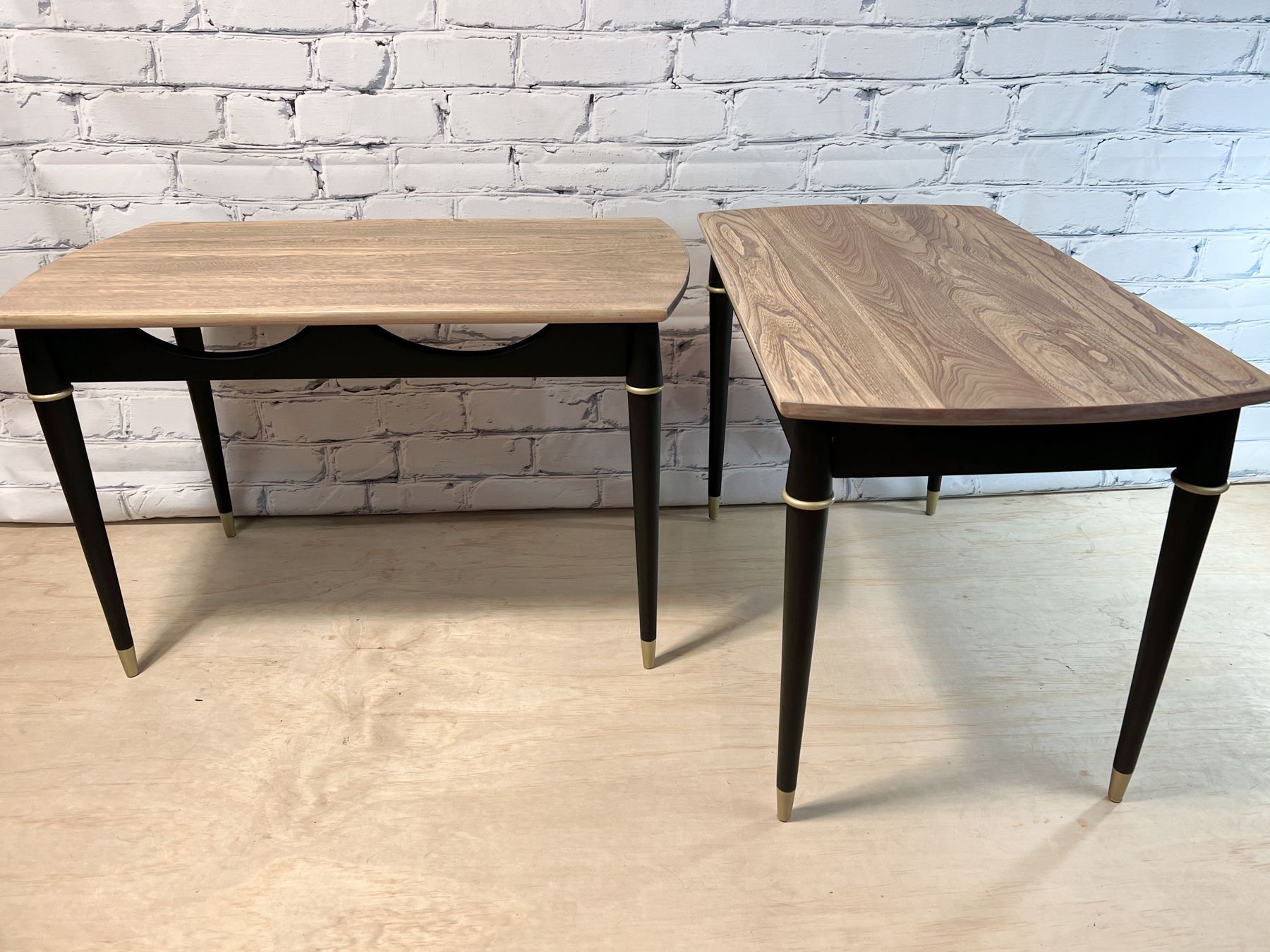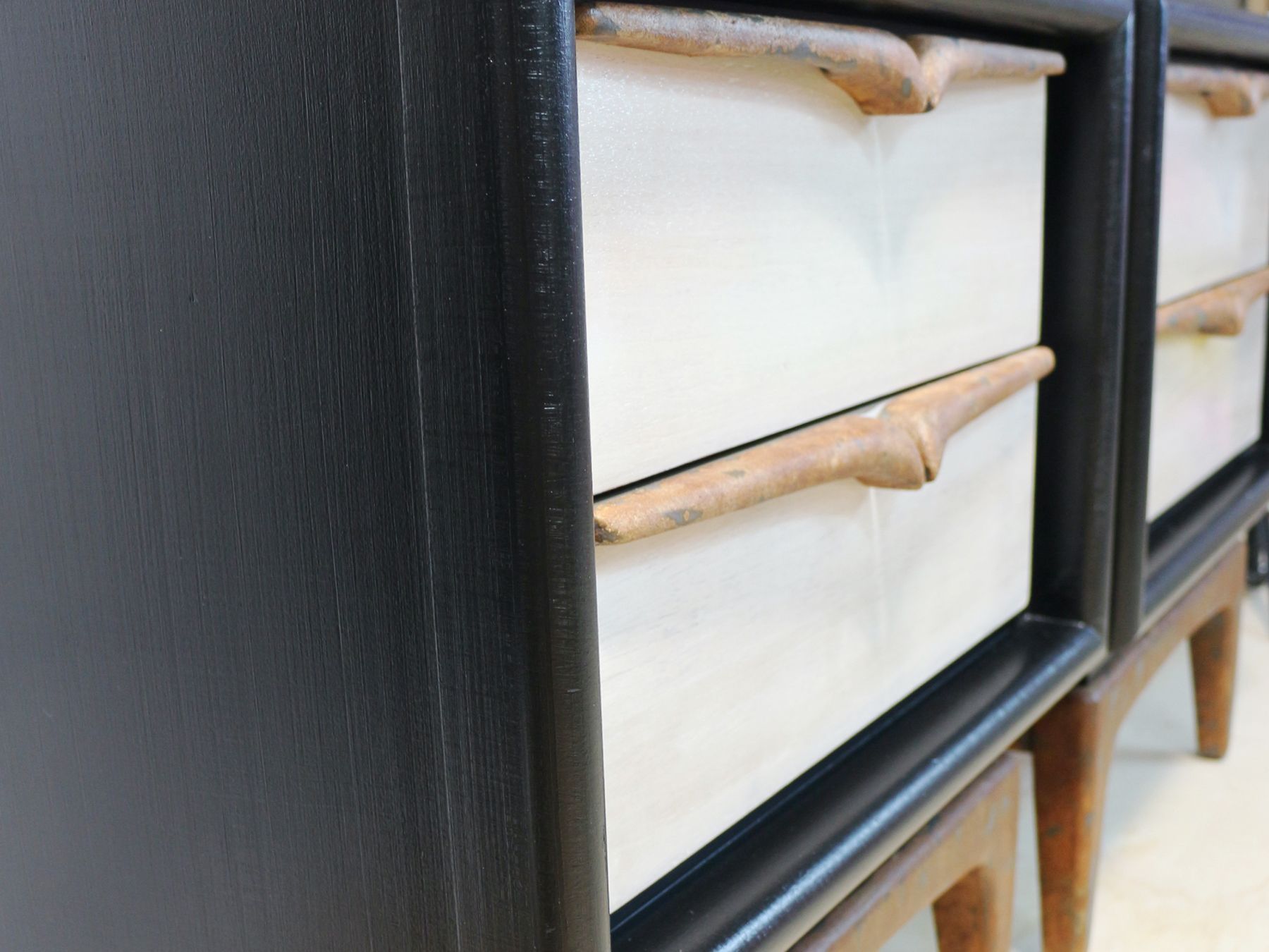Refinished MCM side tables in FMP Coal black, sealed with FMP wax, black. The top has been stripped and sealed with FMP stain and finishing oil in natural.