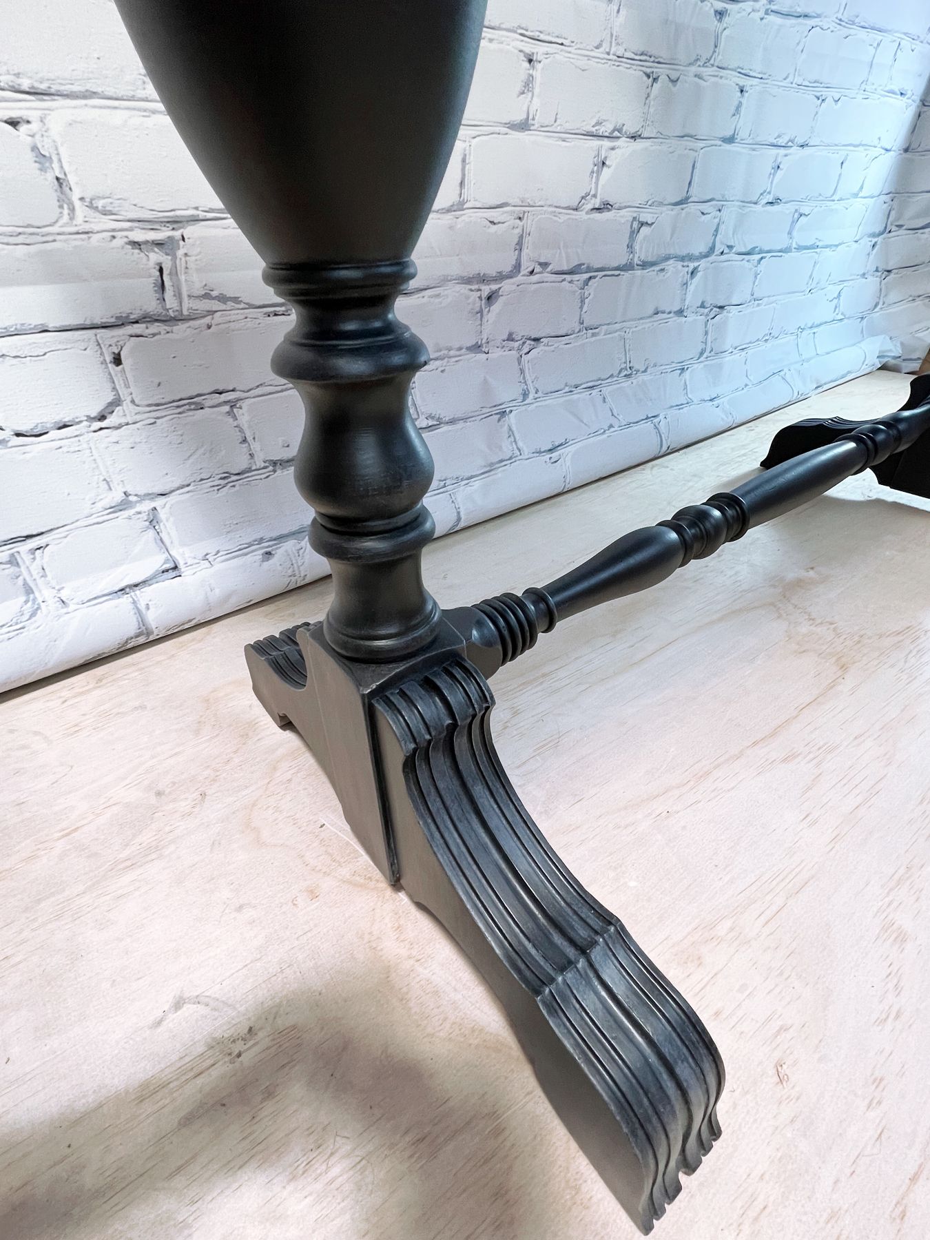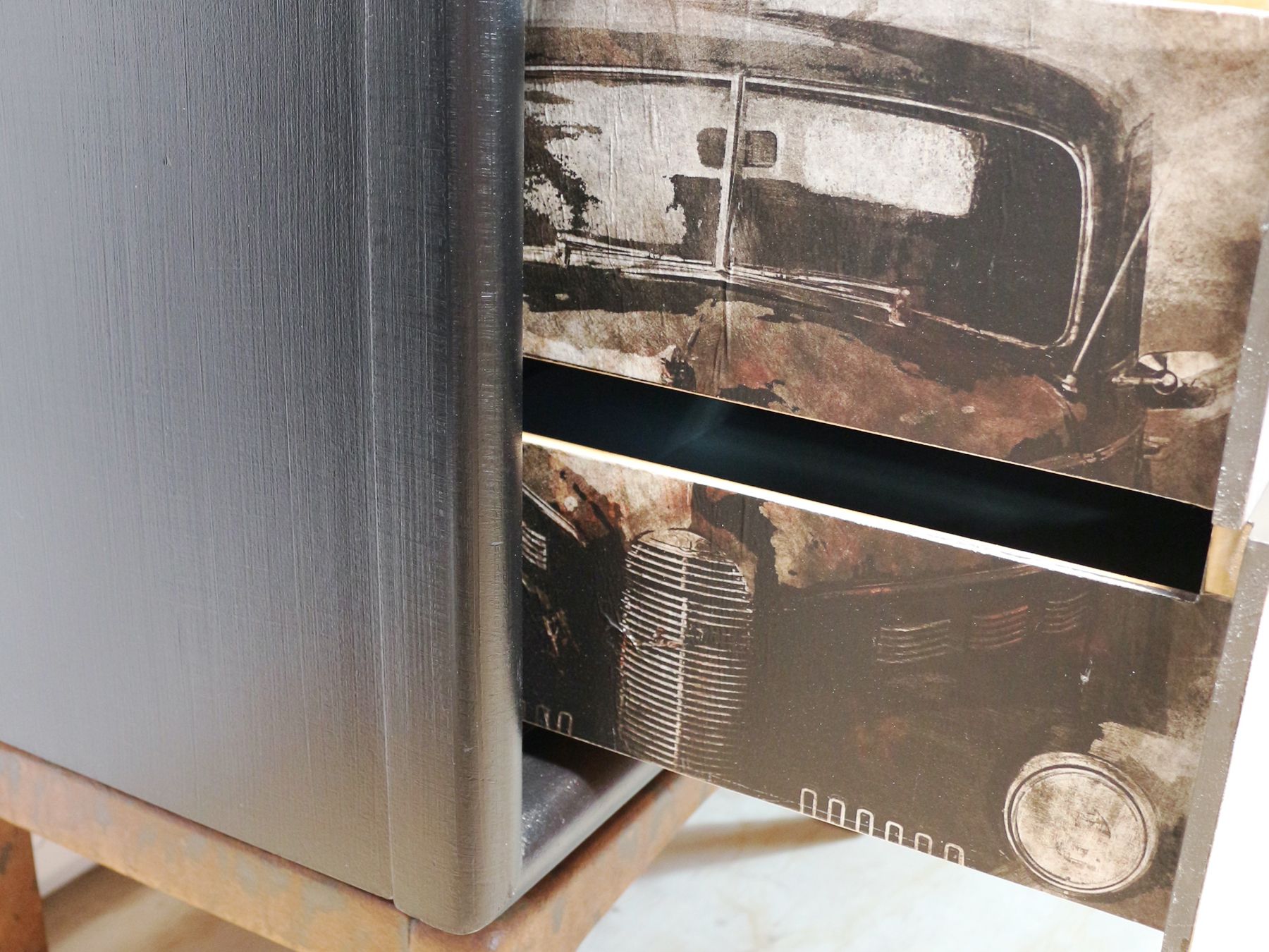 The outside has been given a linen texture effect in FMP Coal Black and sealed with FMP Stain & Finishing Oil. The drawer fronts have been whitewashed and sealed. The handles and legs have been given some added texture and sealed as well.