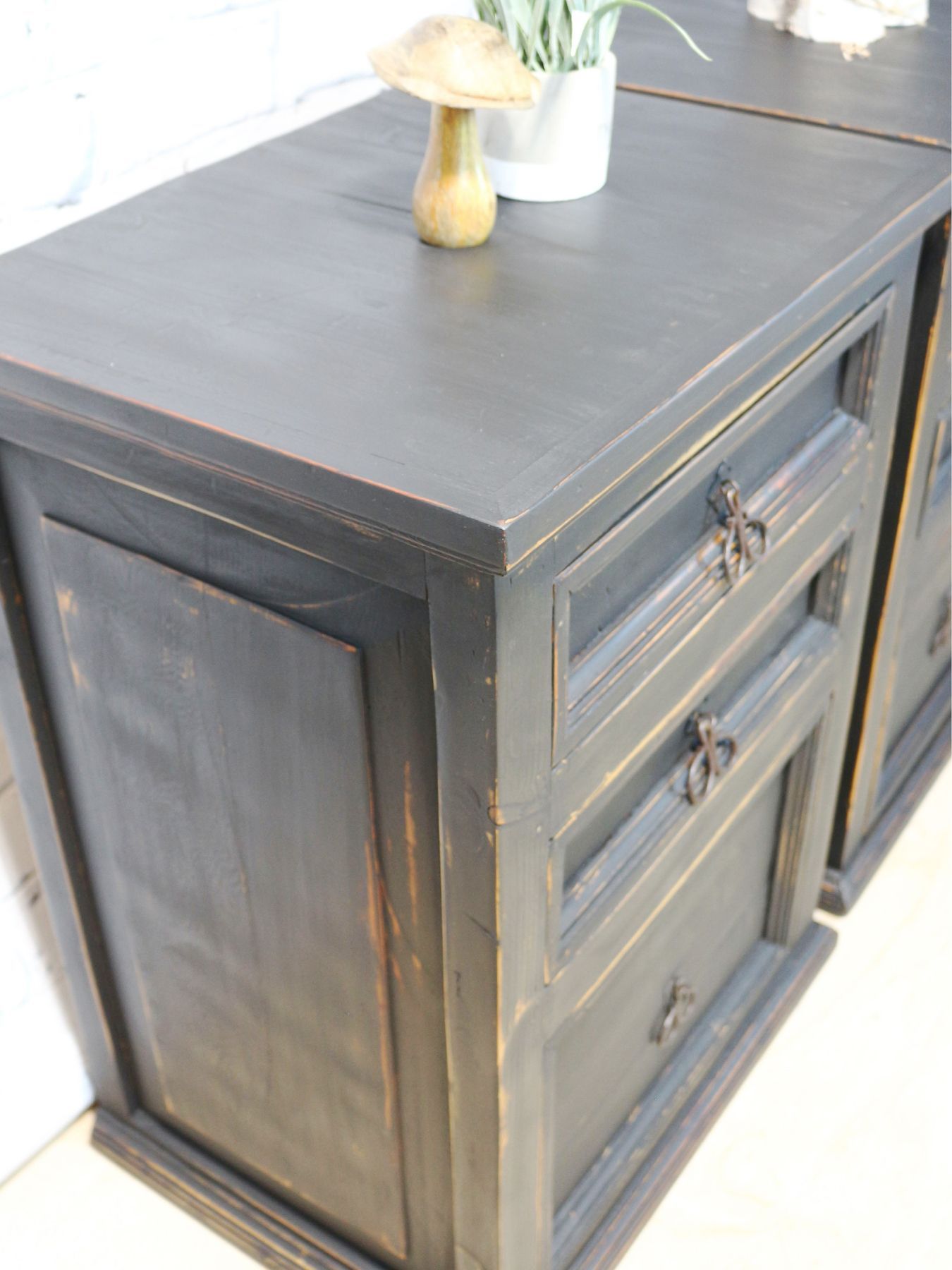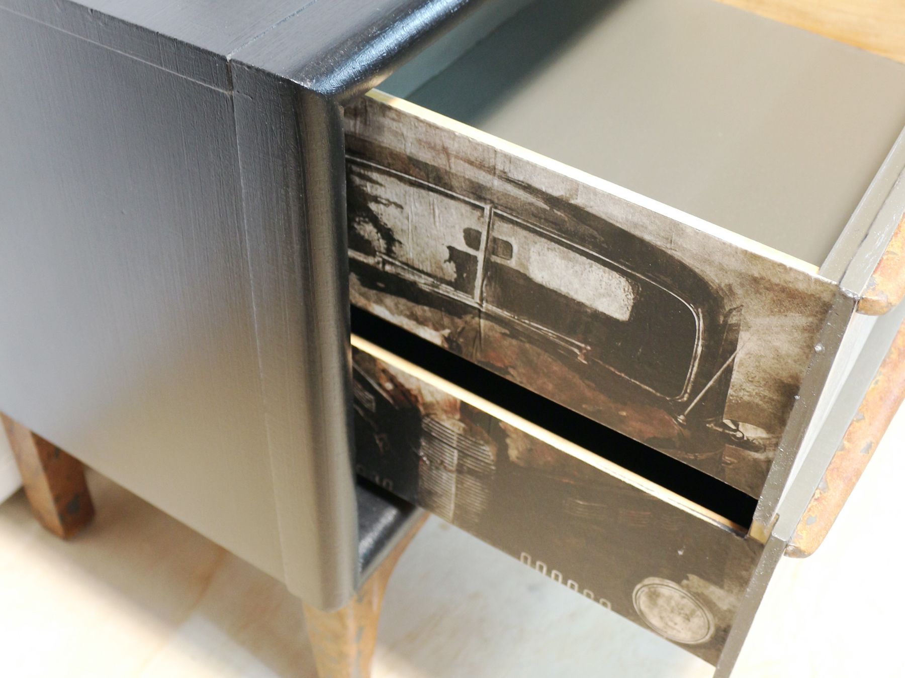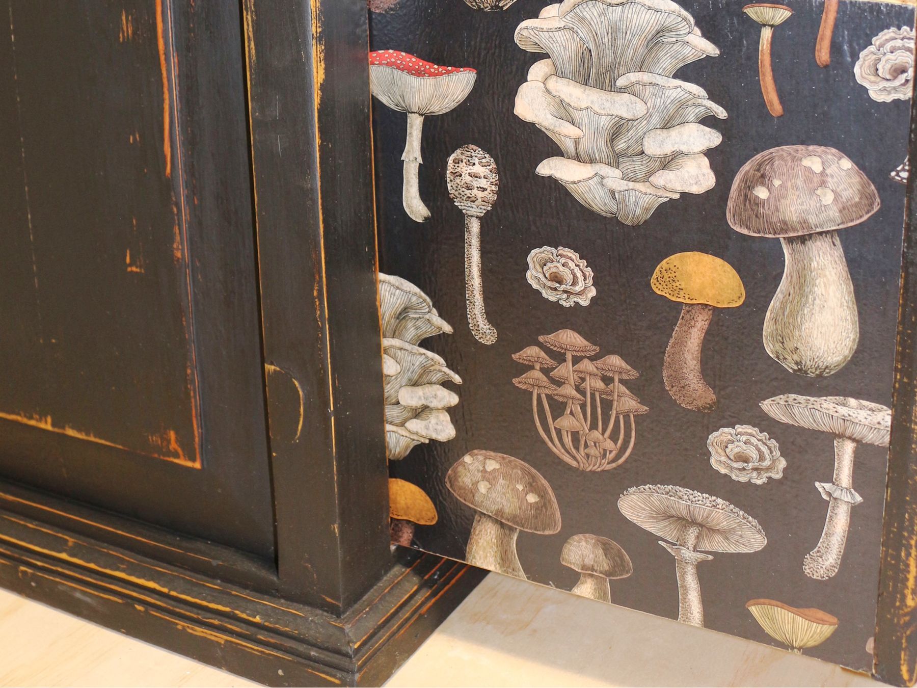 Refinished, distressed solid wood side tables with Fusion Milk Paint in Little black dress and sealed with FMP Hemp Oil. Sides of drawers are decoupaged with a mushroom print and insides drawers are painted with FMP in Fort York Red & sealed with SFO.