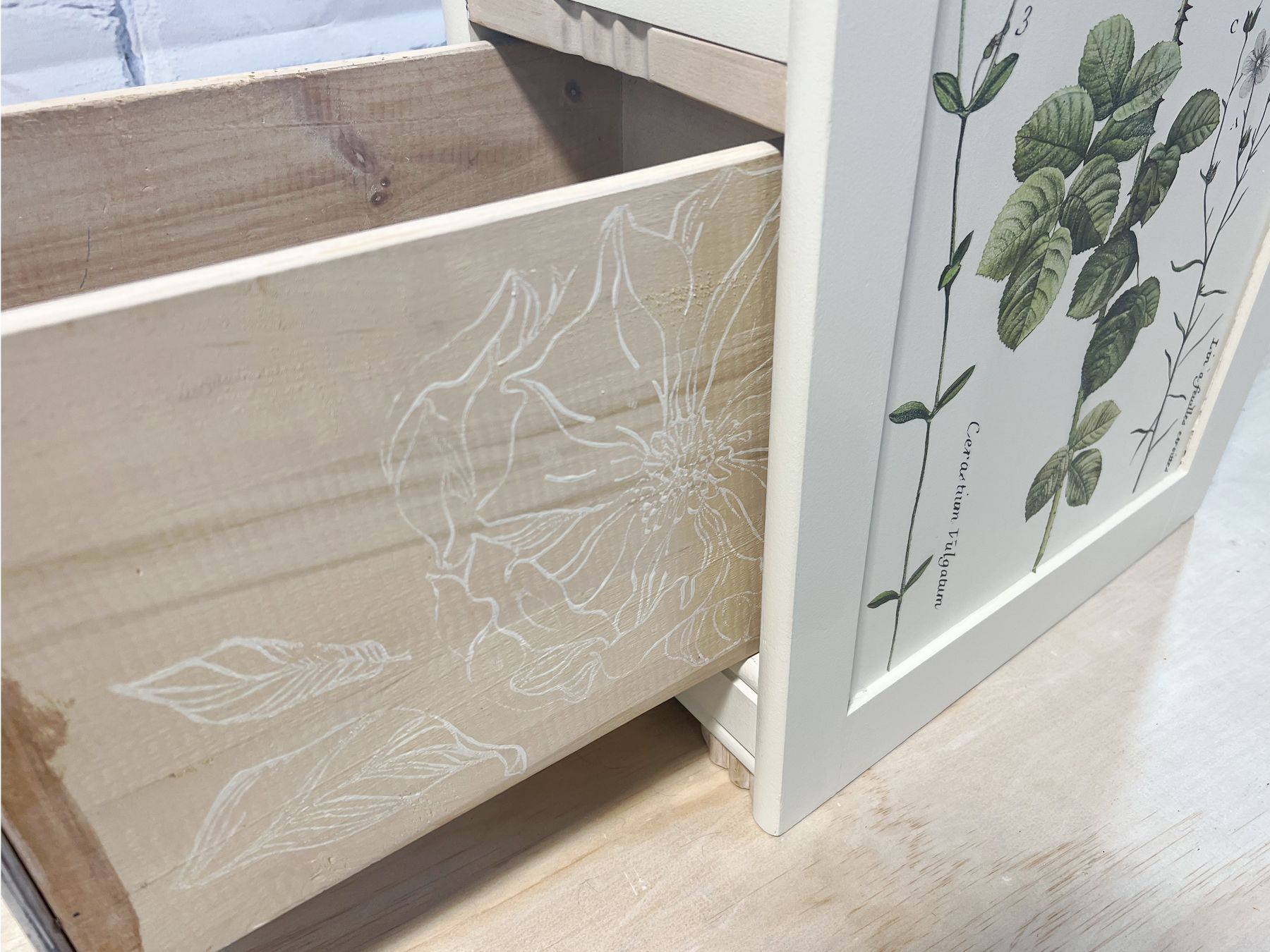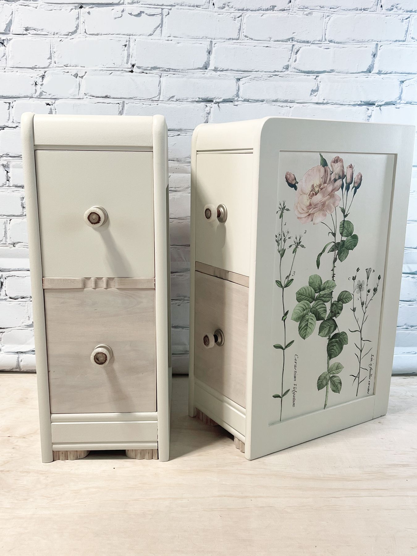 Repurposed vanity desk into side tables. Stripped and painted with FMP Champlain, with floral transfers on the sides and sealed with FMP tough coat. Bottom drawers and legs have been white washed with FMP SFO white.