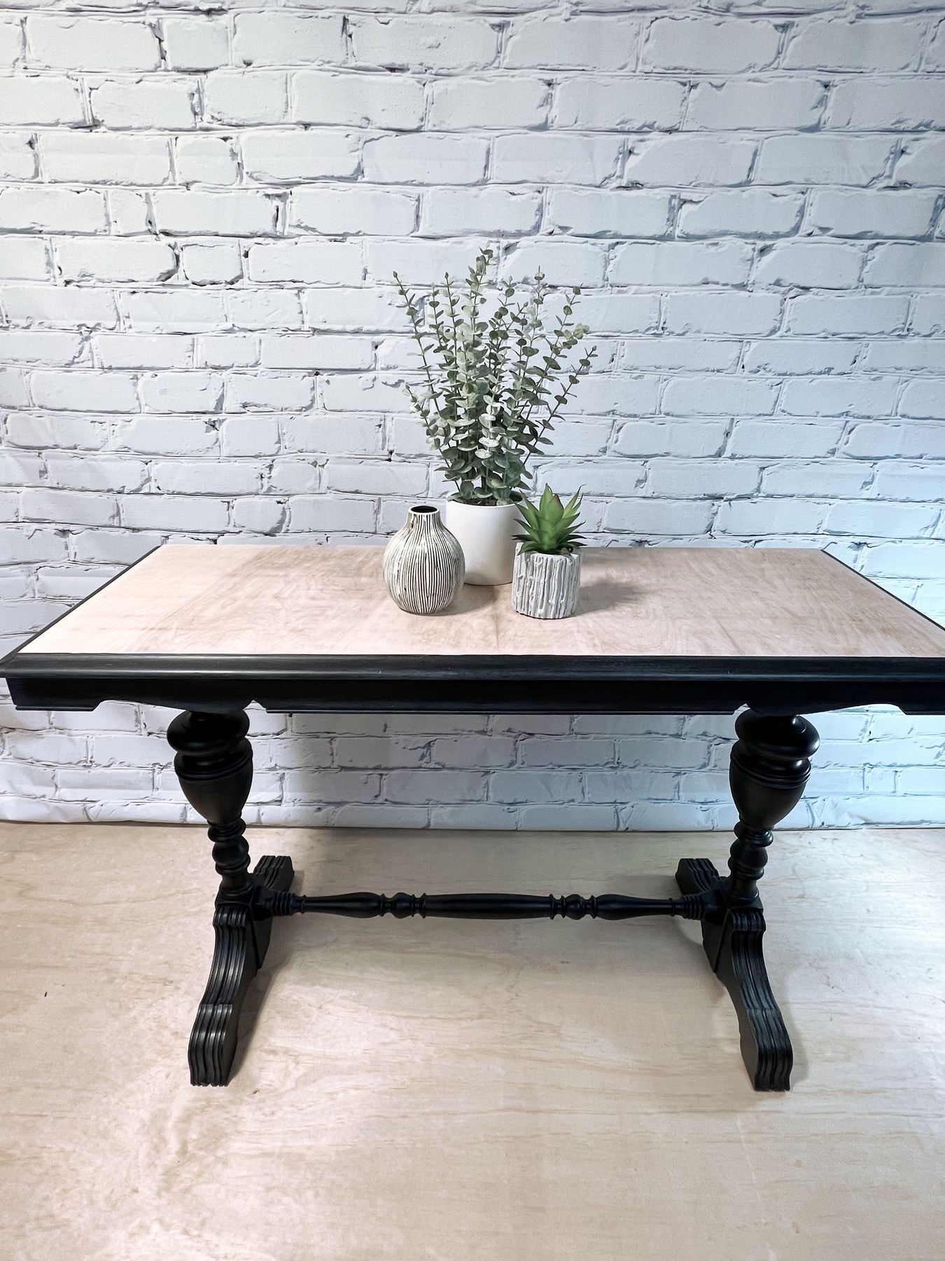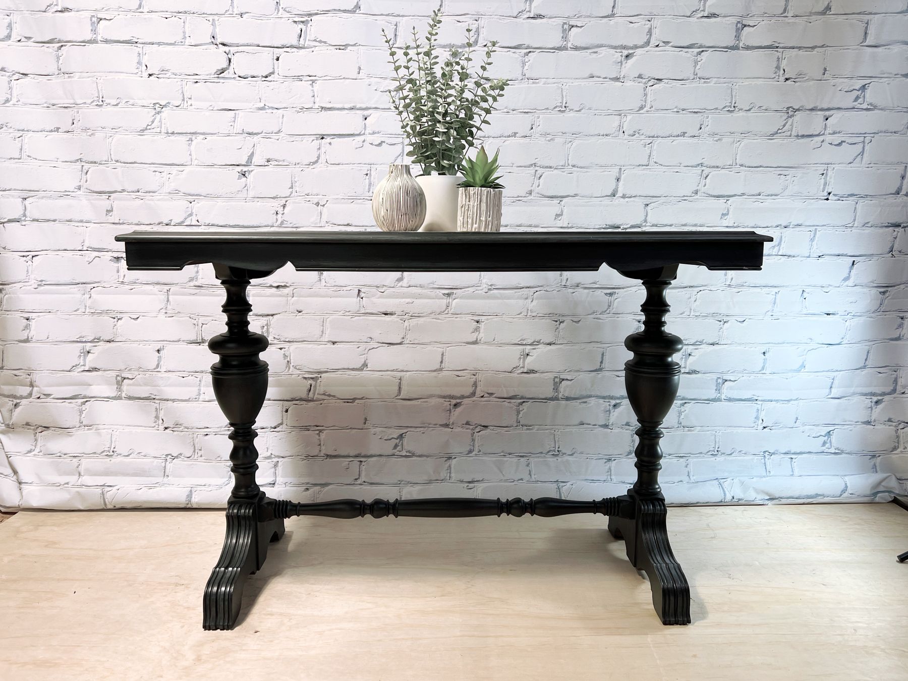 Refinished console/hallway/sofa table in FMP Coal black, aged and sealed with white wax. The top has been stripped and sealed with FMP stain and finishing oil in white.